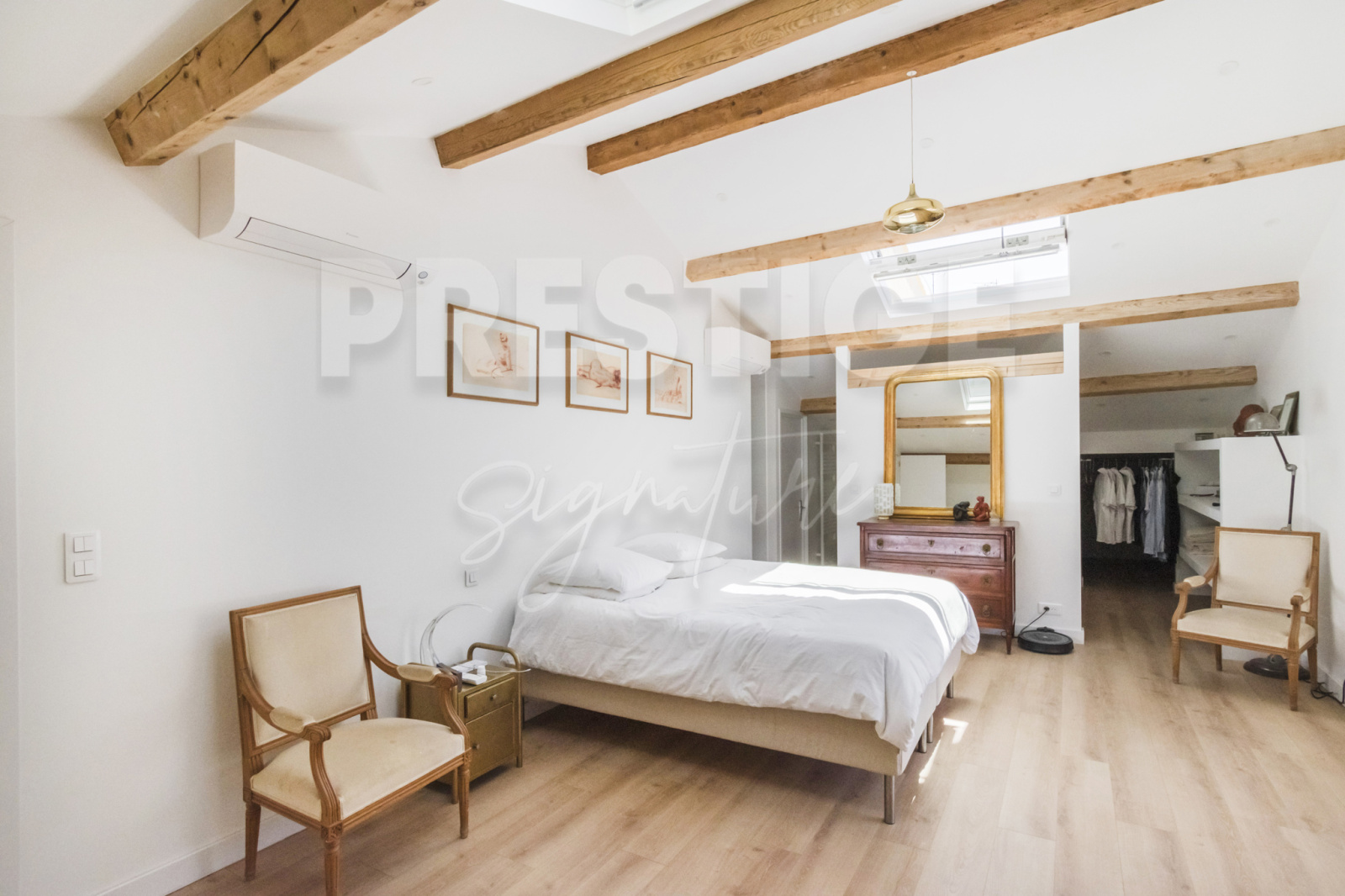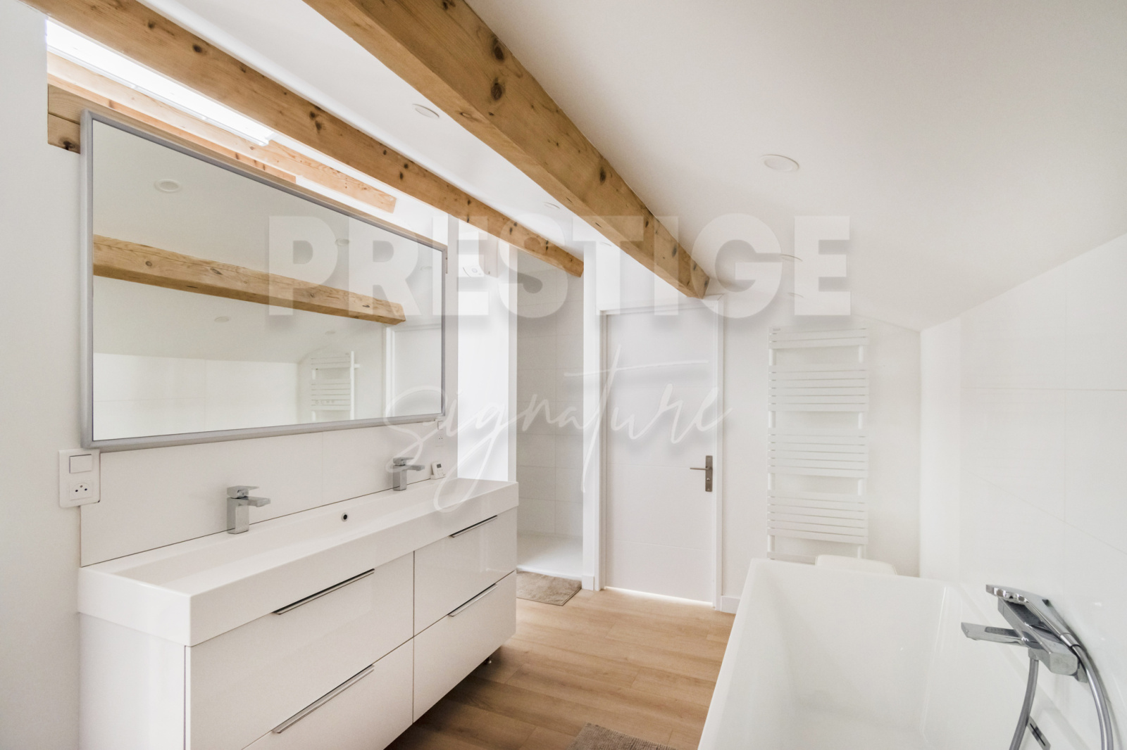 Au dernier étage, sous le faîtage, une généreuse suite parentale très lumineuse avec sa salle de bain.