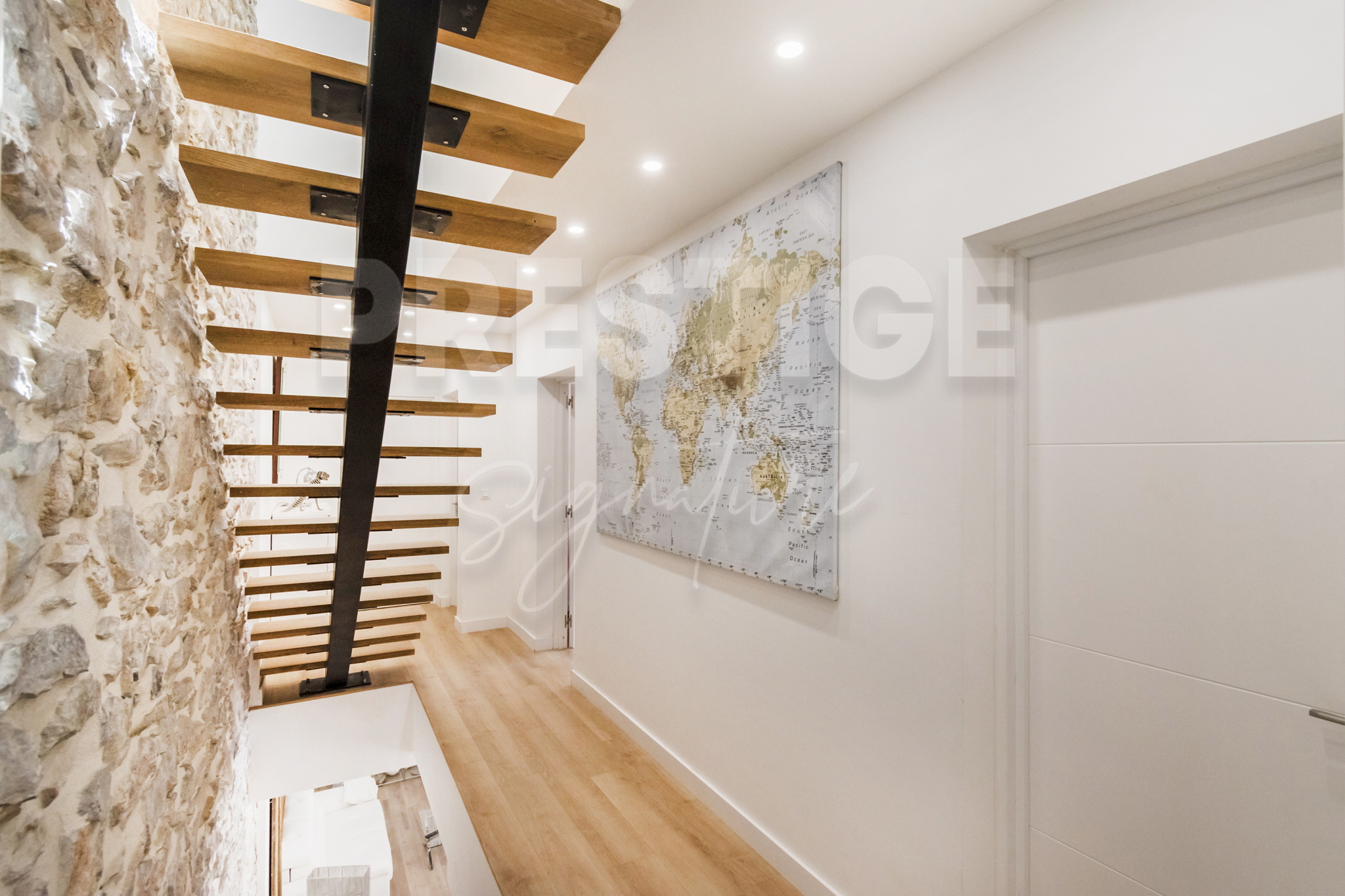 Un escalier sculptural mène à l'étage vers un espace nuit composé d'une grande chambre avec sa salle d'eau privative et sa terrasse et deux autres chambres dont une avec une terrasse sur le toit et une salle d'eau.
