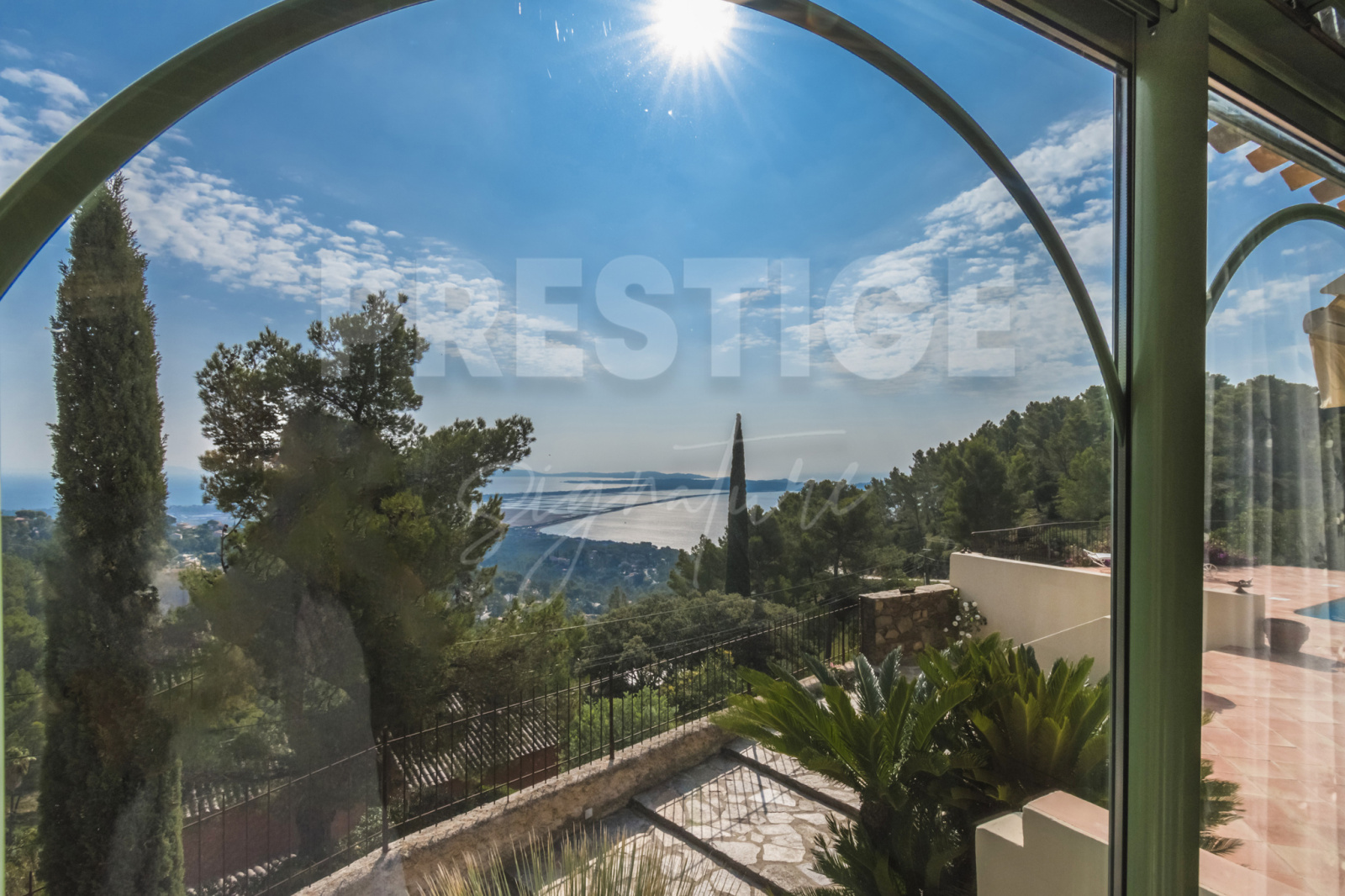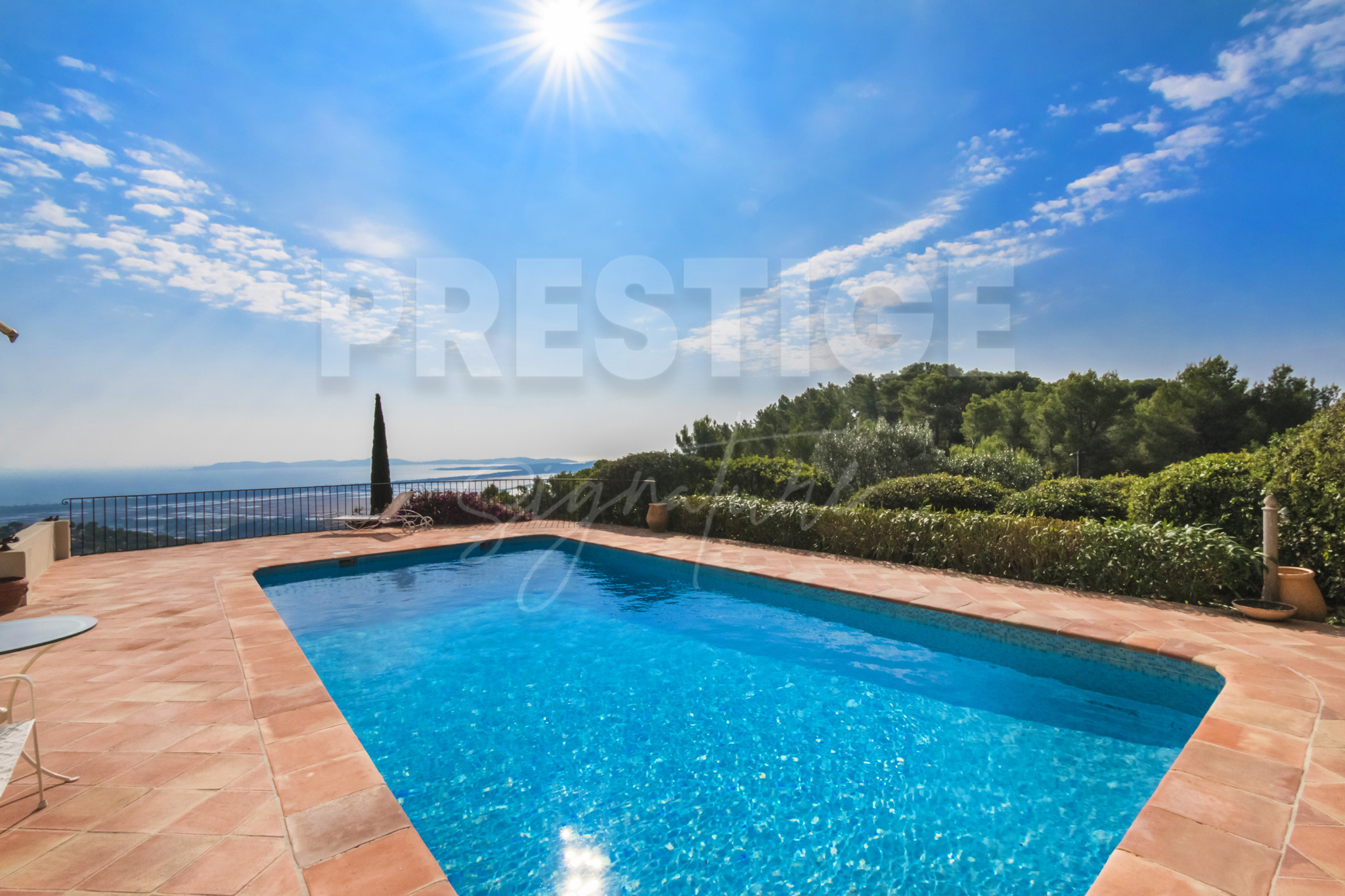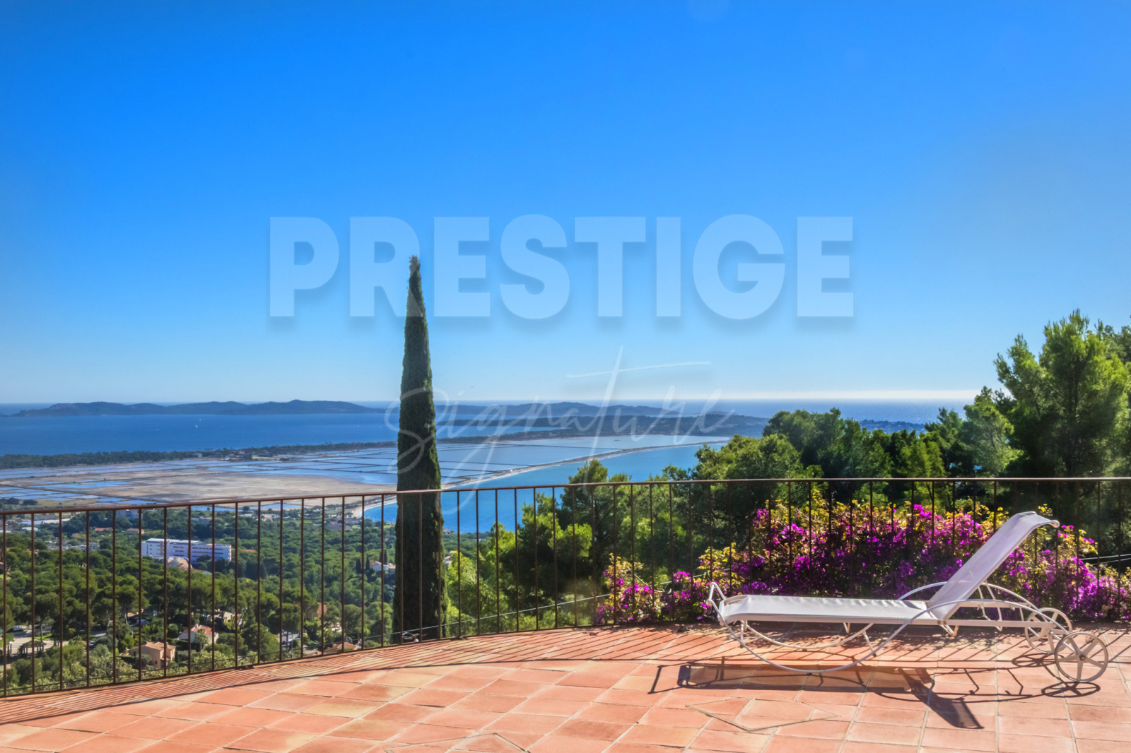 Les extérieurs invitent à la détente avec une somptueuse piscine entourée de terrasses panoramiques , offrant un spectacle permanent sur la Grande Bleue et le tombolo de Hyères.