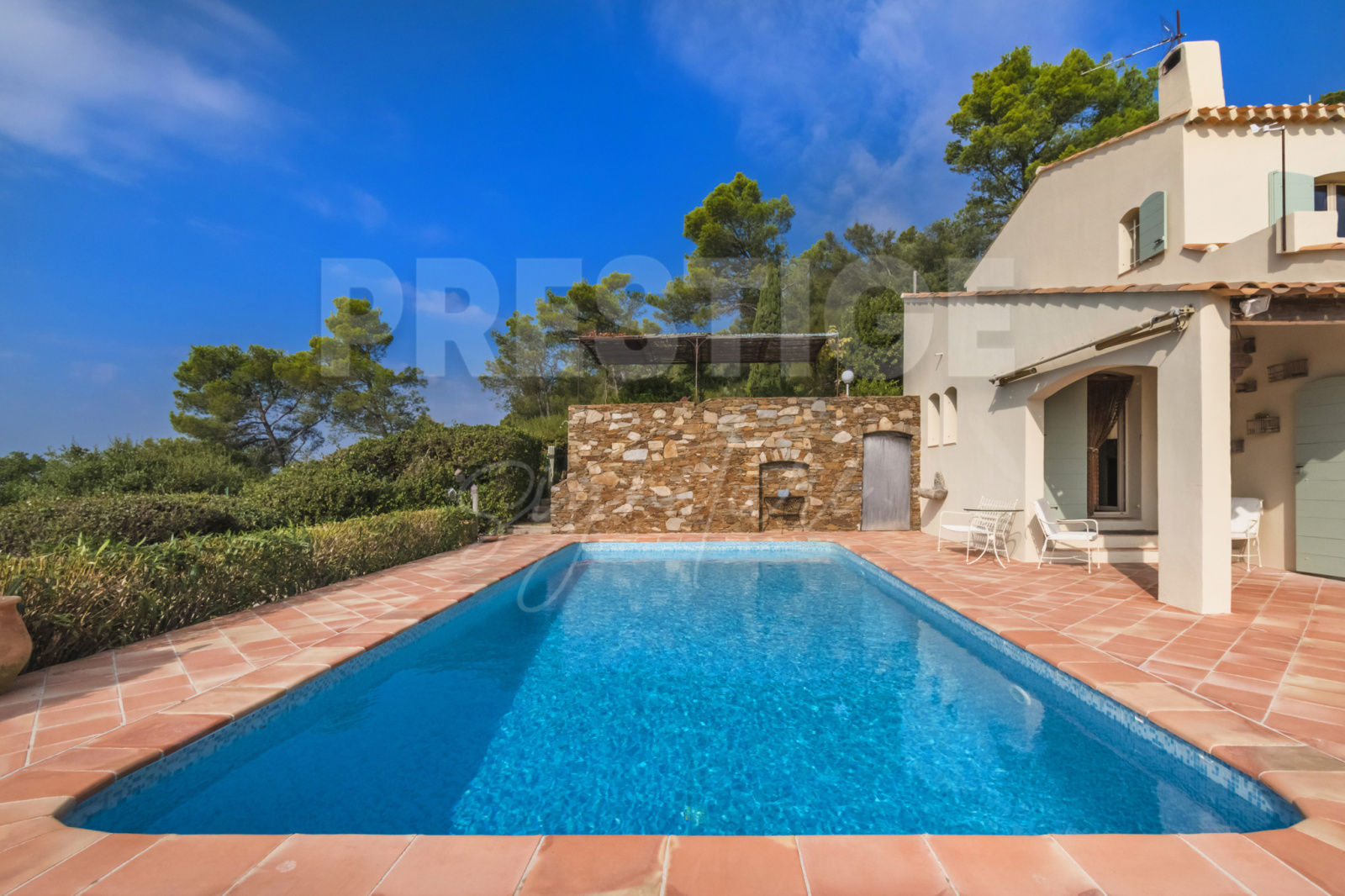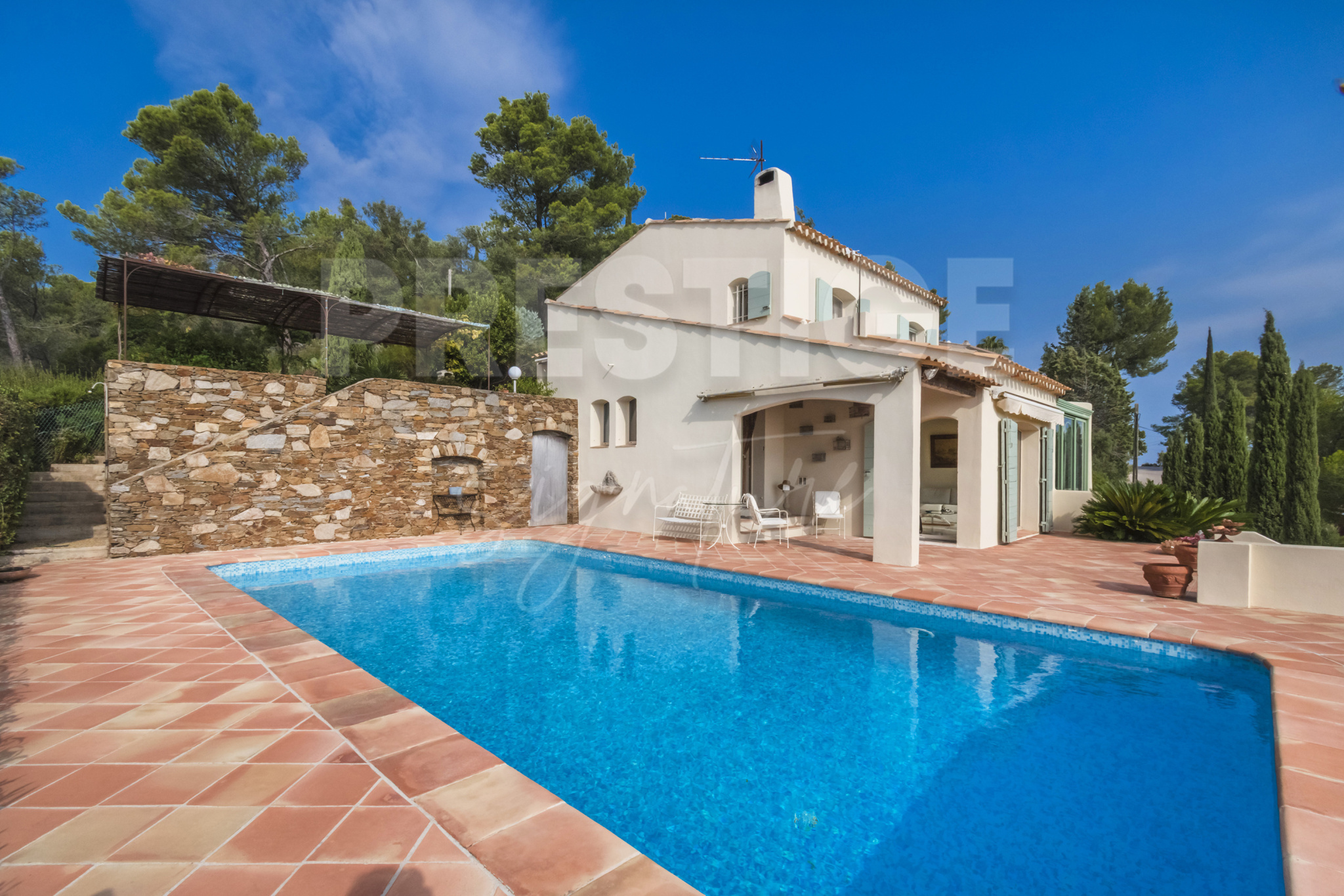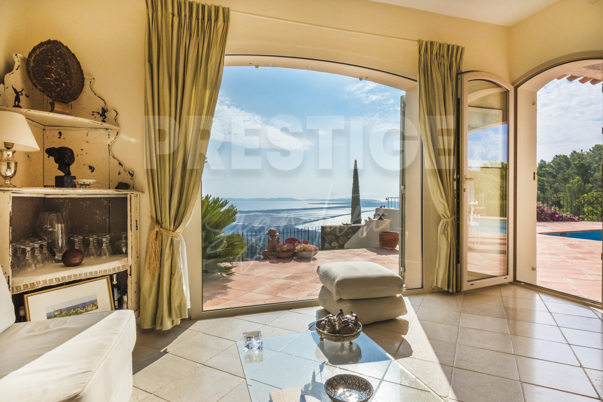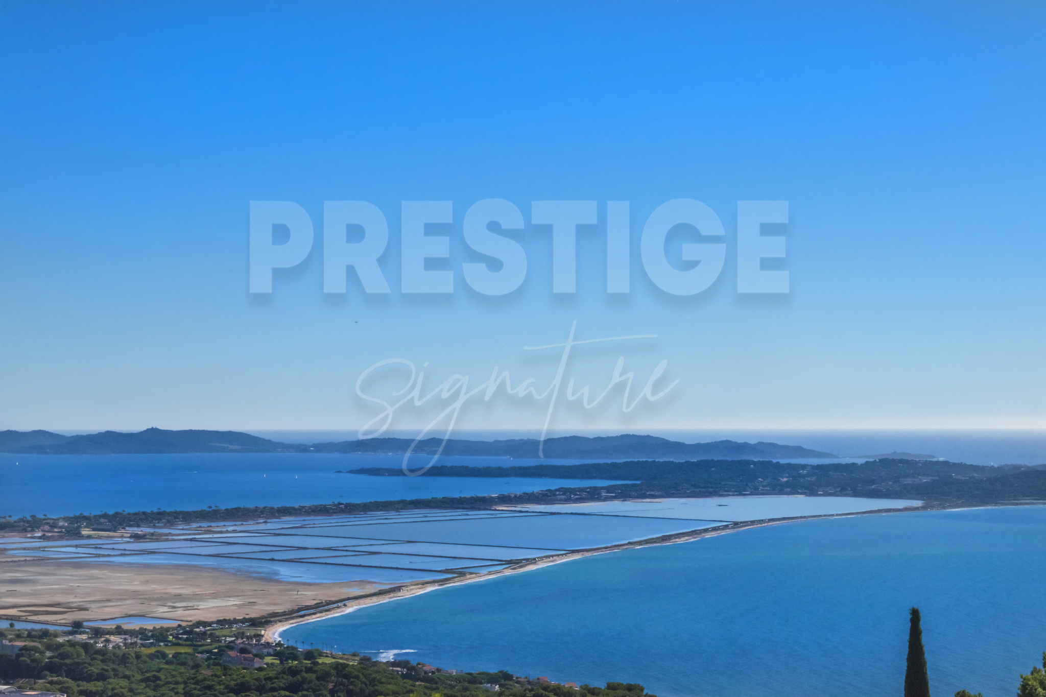 Les extérieurs invitent à la détente avec une somptueuse piscine entourée de terrasses panoramiques , offrant un spectacle permanent sur la Grande Bleue et le tombolo de Hyères.