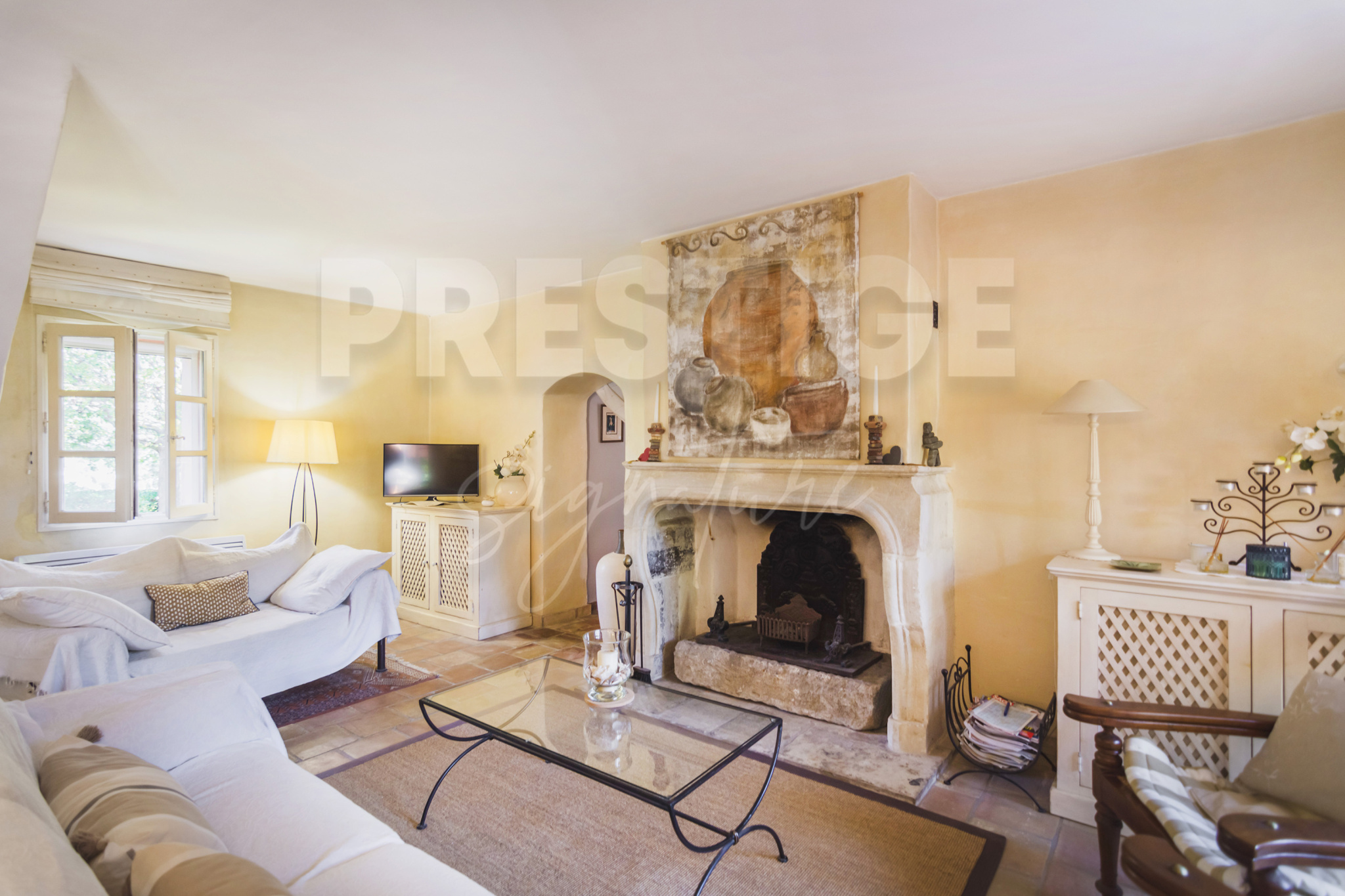 Au rez de chaussée vous trouverez une entrée indépendante, une buanderie, un salon avec sa cheminée en pierre, une cuisine provençale ouverte sur la salle à manger et donnant directement sur une très belle terrasse protégée par une treille en fer forgé ornée de roses blanches au printemps.