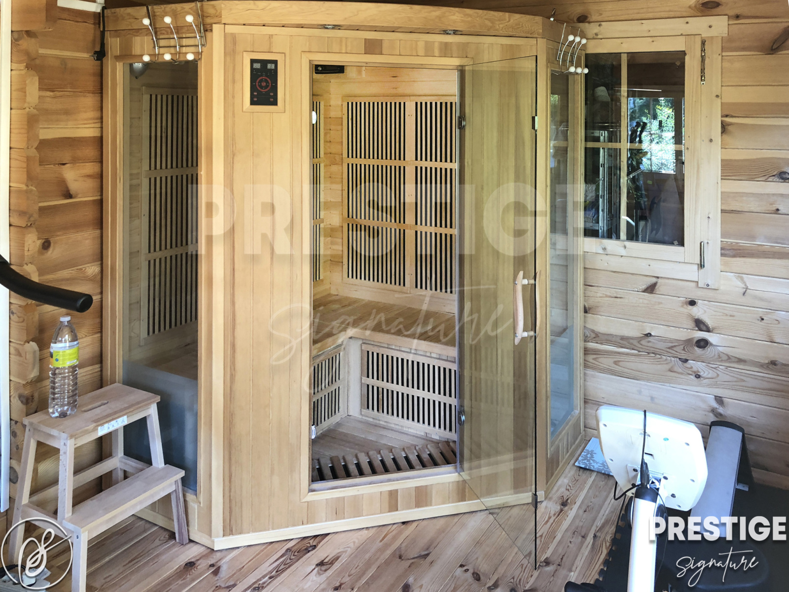 Une magnifique piscine traditionnelle, chauffée et traitée au sel, de 11 x 4 m vous permet de nager trois saisons sur quatre et paresser sur la plage de cet agréable bassin. A proximité, un chalet en bois intégrant un sauna et une de salle de sport attenante vous aidera à rester en bonne forme ;