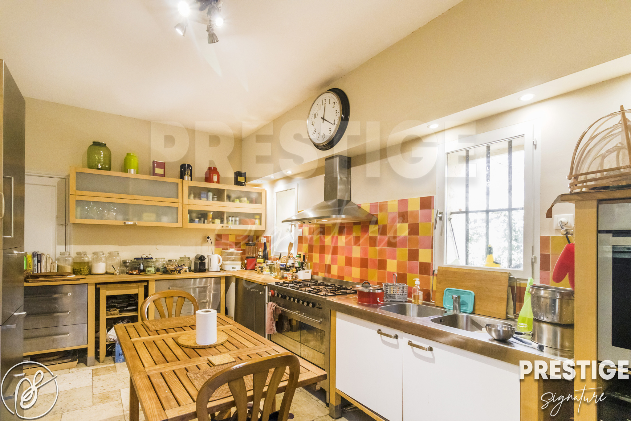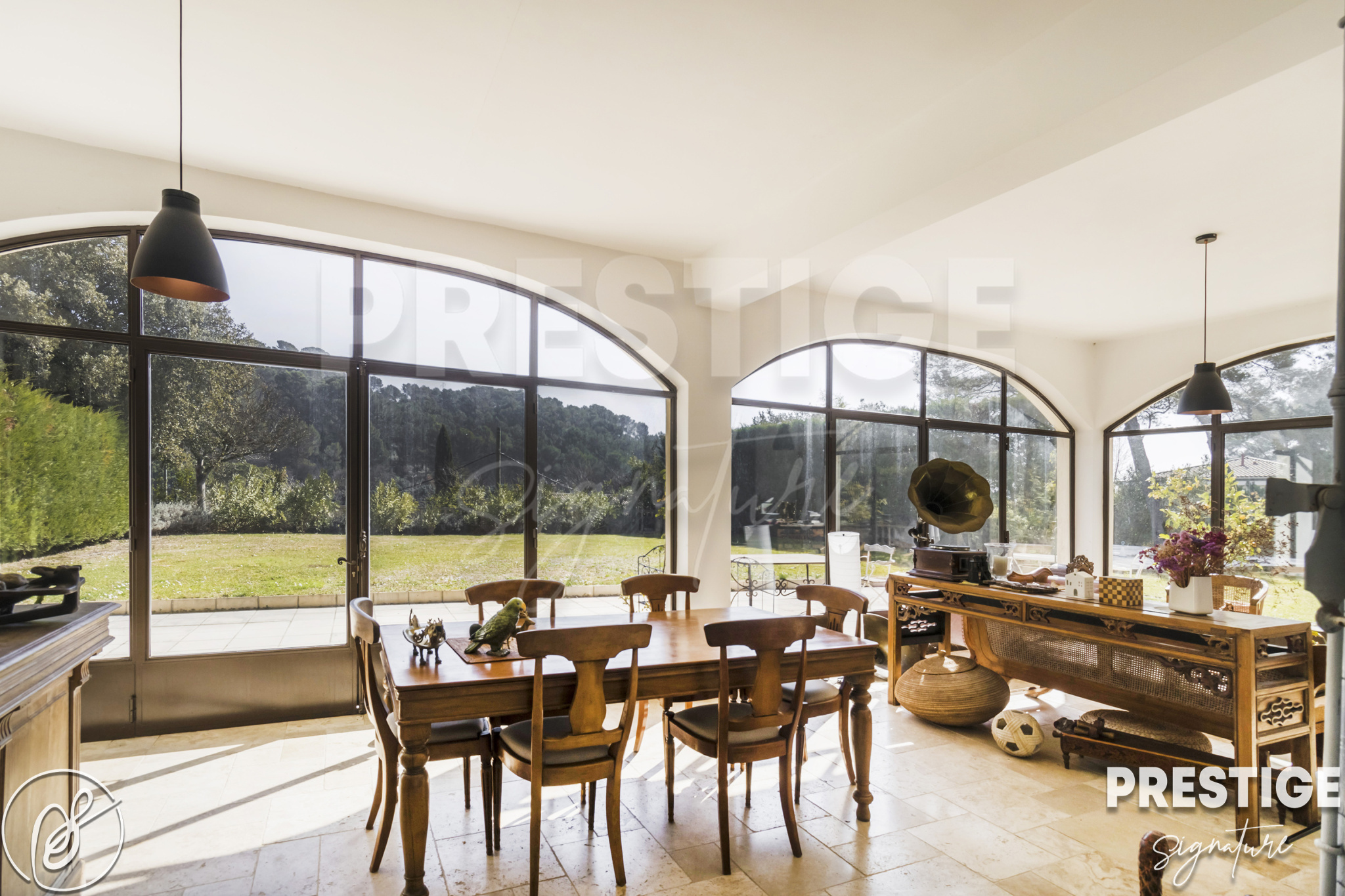 Après avoir franchi la porte en fer de la propriété et la monumentale porte d'entrée d'époque en bois massif, vous trouvez face à vous un escalier avec une très belle boule en marbre du Tholonet. Sur la gauche un bureau de 13m², puis une grande cuisine familiale de plus de 15m². Sur la droite un très grand séjour salon lumineux avec un plafond à caissons de près de 40m², prolongé par une magnifique verrière elle aussi de 40m², avec de grandes baies en ferronnerie à travers lesquelles vous pouvez admirer la nature.