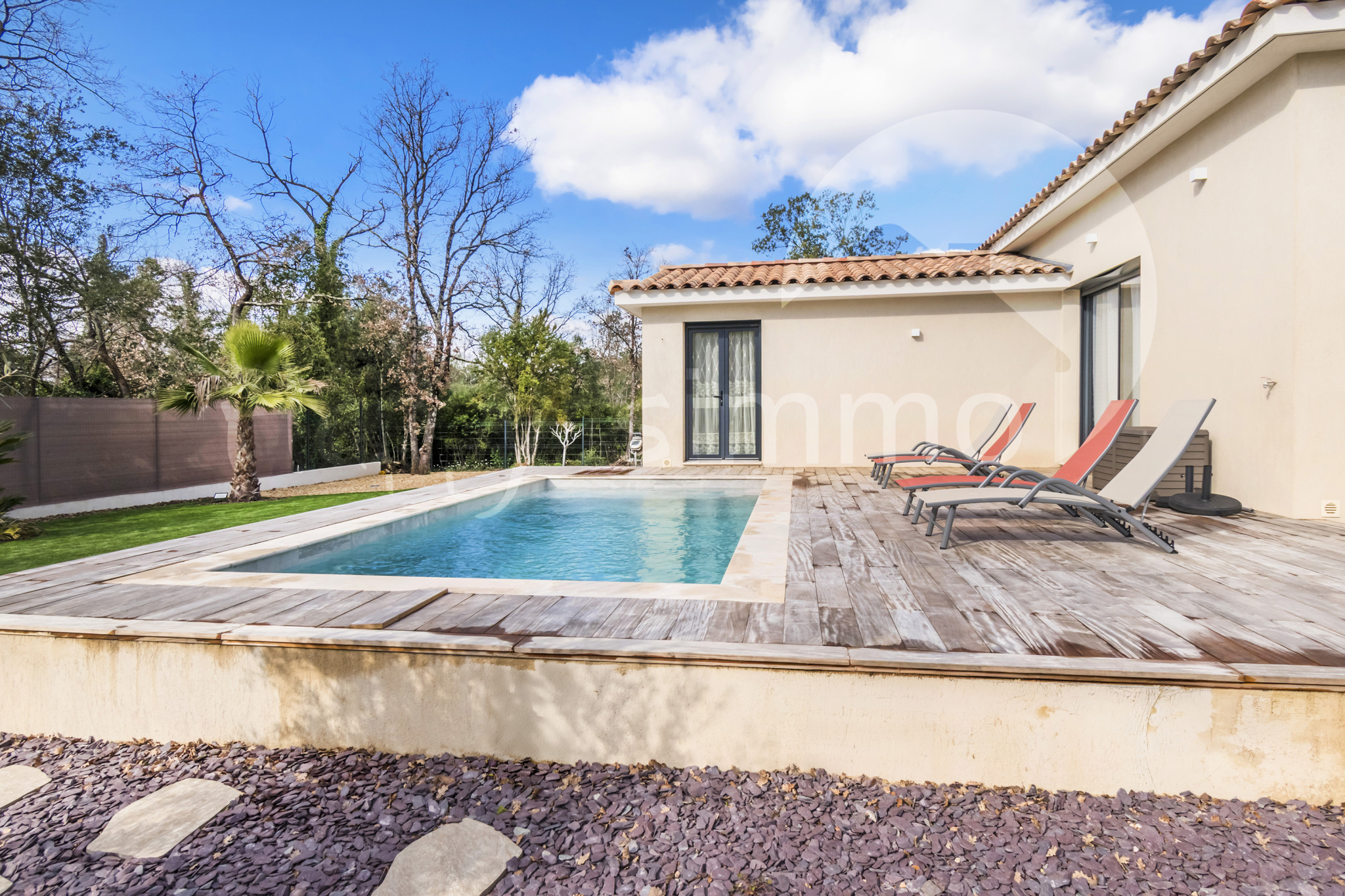 A l'extérieur, une piscine traditionnelle au chlore et une belle terrasse en bois .