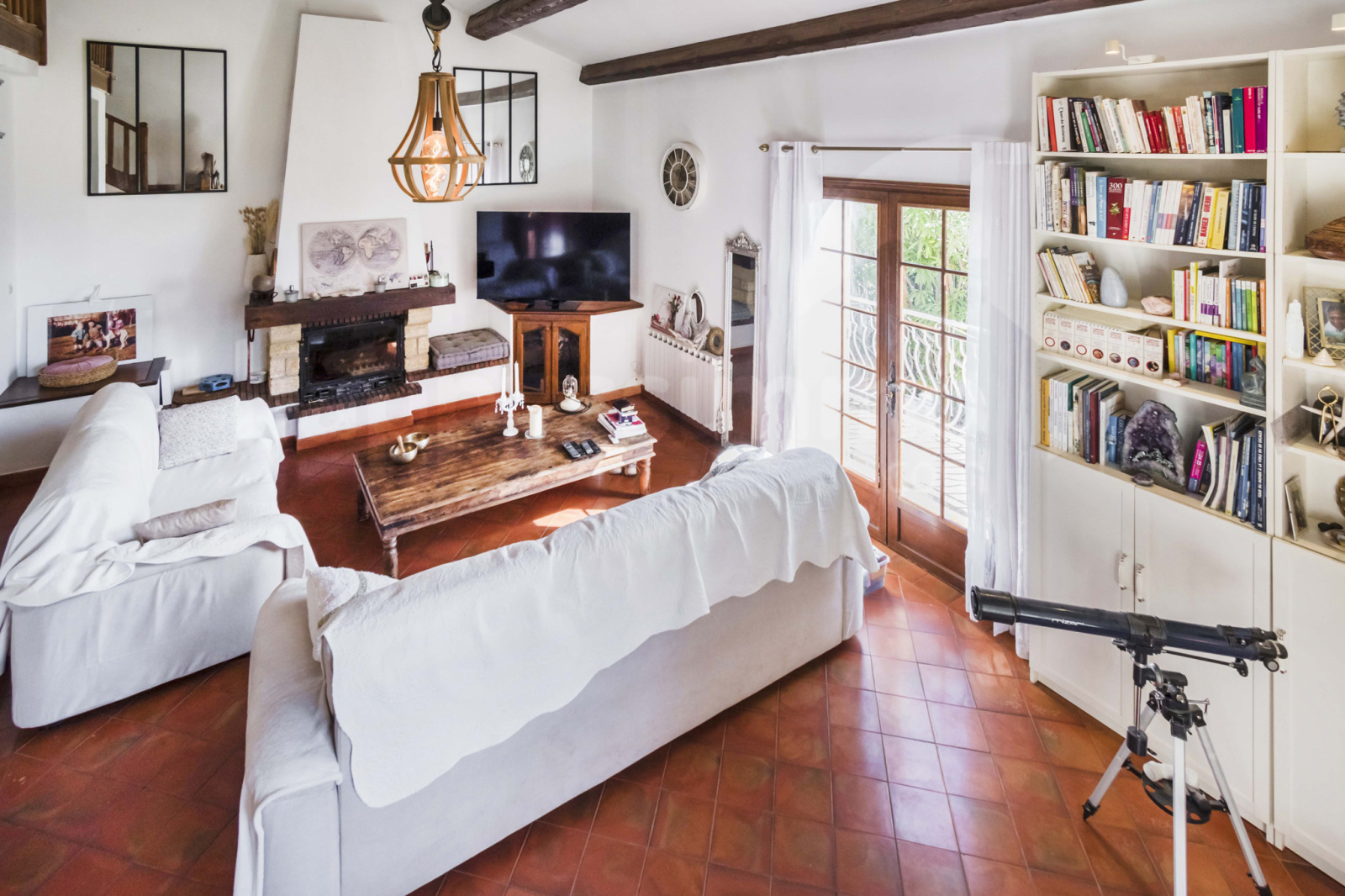 -Une cuisine ouverte sur la salle à manger et le salon avec cheminée, offrant une belle hauteur sous plafond.