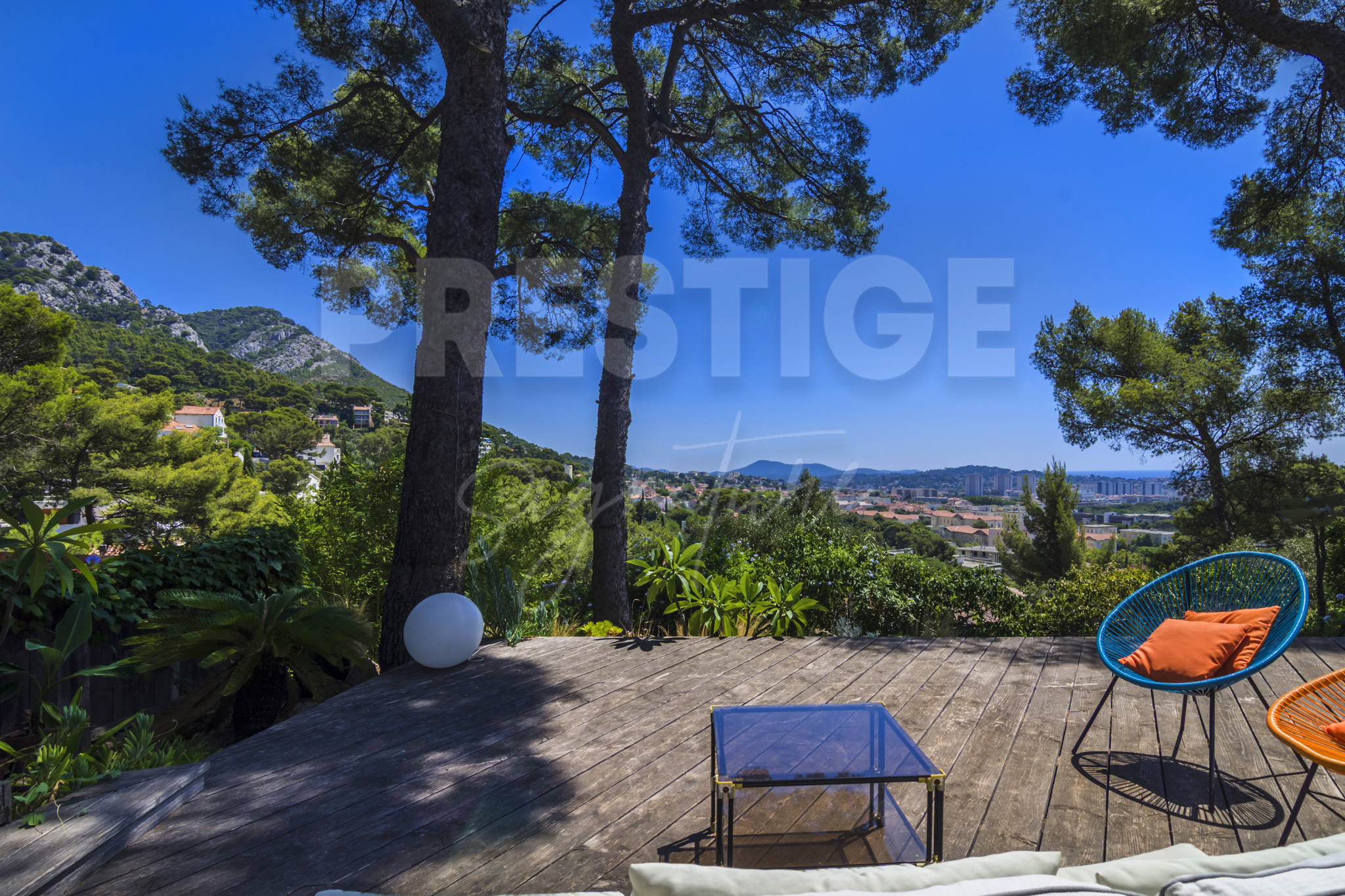 Dominant la ville, la maison profite d’une vue panoramique exceptionnelle sur la rade de Toulon, considérée comme l’une des plus belles d’Europe, ainsi que sur les reliefs environnants. Un décor naturel grandiose, idéal pour les amoureux d’activités sportives, de plein air et de grands espaces.